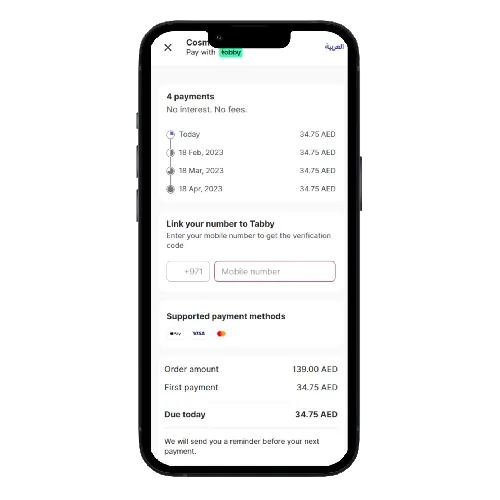 Add what you want to your cart and choose Tabby at checkout. Sign up, link any card, and get approved instantly. Pay only 25% upfront and we'll remind you about the rest. Completely free, with no interest.